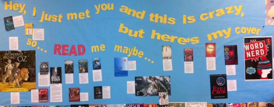 This is an amazing bulletin board done by Heather Daly our Library and Information Coordinator for and President of the BC Teacher-Librarians' Association. She has used covers of books and the popular Carly Rae Jepson song "Call Me Maybe" to promote various novels for Middle Schoolers.